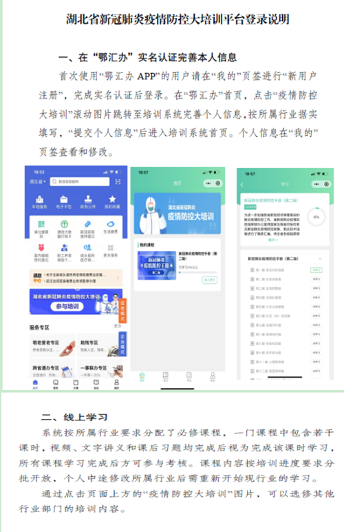 各级疫情防控机构和专兼职人员需下载“鄂汇办APP”,完成“新用户注册”,实名认证后登录。在“鄂汇办”乐动(中国),点击“疫情防控大培训”滚动图片跳转至培训系统完善个人信息,根据自己所属行业据实填写,系统按照不同行业需求自动分配必修课程,一门课程中包含若干课时,视频、文字讲义和课后习题均完成后视为完成该课时学习,所有课程学习完成后方可参与考核。经线上考核合格的参训人员可获得培训合格证明。